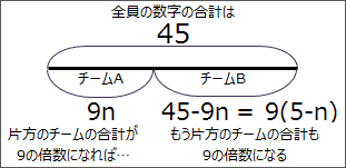 次に9人を2つのチームに分けてみます。何人と何人のチームでも構いません。とにかく2つのチームに分けます。片方のチームの数字の合計が 9 の倍数(9nとする)になったとします。すると、もう片方のチームの数字の合計は、45 - 9n です。45(9 の倍数)から 9 の倍数を引いているので、当然これも 9 の倍数になります。